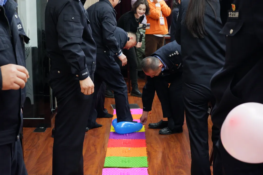 一个团队中最重要的是齐心协力,攻坚克难。在暖身环节,大家把身体当作工具,去合力拼凑出一个个造型。“大家现在摆出交通工具的造型!”有的人跟随指令,把身体当车身,把四肢作车轮,组成火车的造型;有的人奇思妙想,排列成沙发的造型。民警职工们充分发挥天马行空的想象力,大家喜笑颜开,其乐融融,压力都得到了缓解。