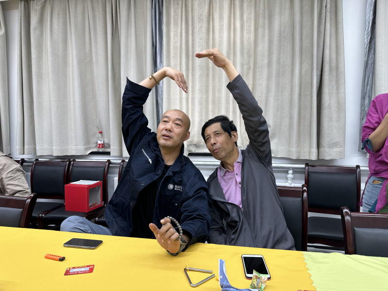 在音乐身体律动环节,带领老师首先让职工们跟随音乐进行倾听与感受。在音乐节奏缓慢地引导下加入基本动作,随节拍进行练习,使职工们感受稳定的身体控制力,从而建立身体与音乐之间的连接。随后,根据自身感知的节奏感以及肢体动作的娴熟度,以达到链接身体的灵活性、力量控制以及动作之间的连贯性。在这个过程中去激发作为成人失去已久的感受力及与身体之间的律动,达到身心和谐。